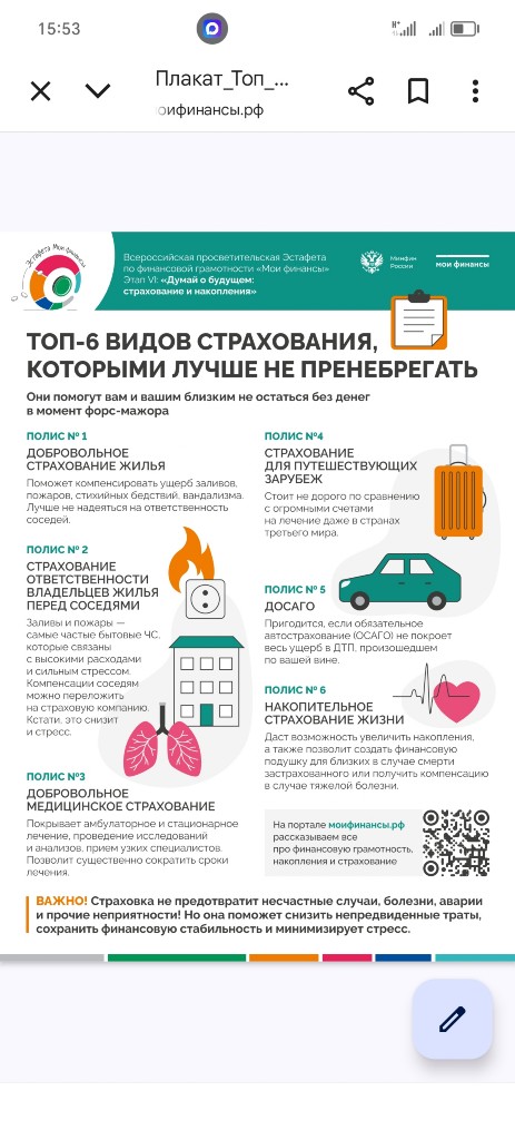 В МБОУ СОШ №33 ст. Архангельской завершился 6 этап эстафеты «Мои финансы» по теме: «Думай о будущем: страхование и накопление». Учителя, обучающиеся и их родители были ознакомлены с программой долгосрочных сбережений, правилами как правильно оформить страховку, чтобы защитить себя от реальных рисков и точно получить компенсацию